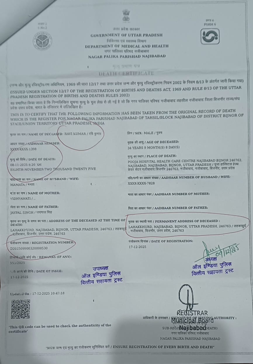 श्रीमती ममता पत्नी स्वर्गीय रवि कुमार (ड्राईवर) गांव-लाहक़ खुर्द, नजीबाबाद, जिला-बिजनौर, उत्तर प्रदेश के निवासी थे। जोकि हमारी संस्था से दिनाँक- 25/07/2025 को जुड़े थे जिनकी आई डी संख्या-237 थी। जोकि दिनांक-08/11/2025 को अग्रवाल पेट्रोल पम्प के सामने स्कूटी से टक्कर लगने के कारण सिर में अत्यधिक चोट लगने के कारण मृत्यु हो गई। इस संस्था के द्वारा 5000/- रूपये की मासिक पेंशन बच्चों के पालन पोषण हेतु दिनांक - 05/01/2026 से SBI खाता संख्या - 44463750197  मैं जारी की जायेगी।